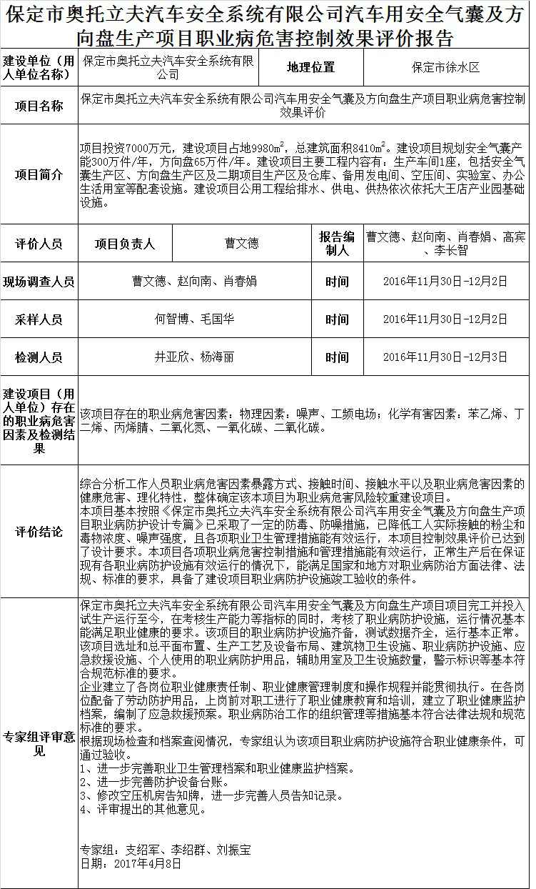 保定市奥托立夫汽车安全系统有限公司汽车用安全气囊及方向盘生产项目职业病危害控制效果评价